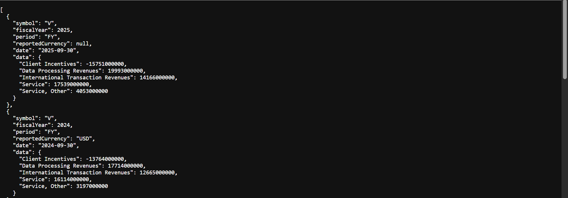 You can access specific revenue breakdowns using the Revenue Product Segmentation API, which provides line-item details like "Service Revenue" or "Client Incentives" often buried in the notes of financial statements.