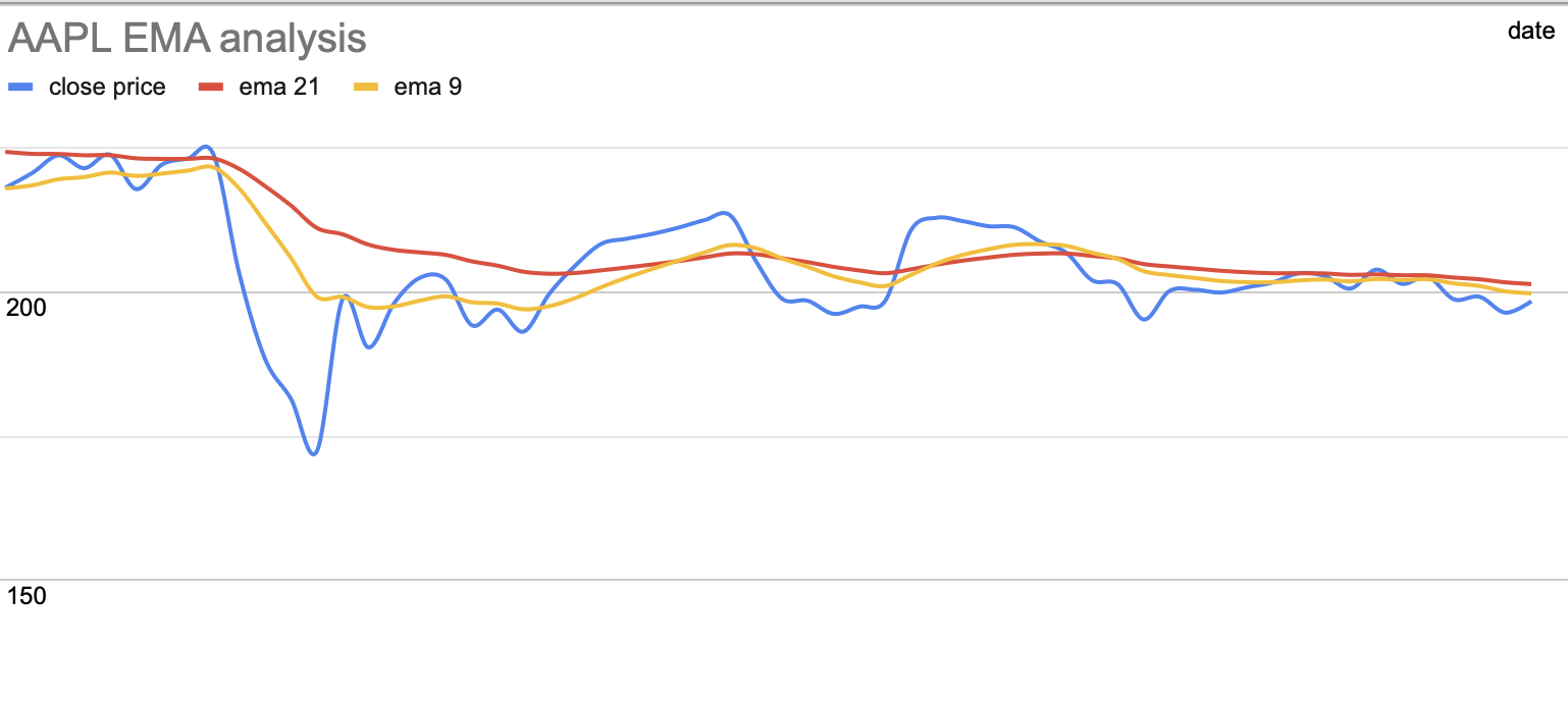 To visualize what the API returns, consider the EMA example: fetching a 10-day EMA for AAPL yields a response like below, which includes each date's OHLCV and the computed EMA: