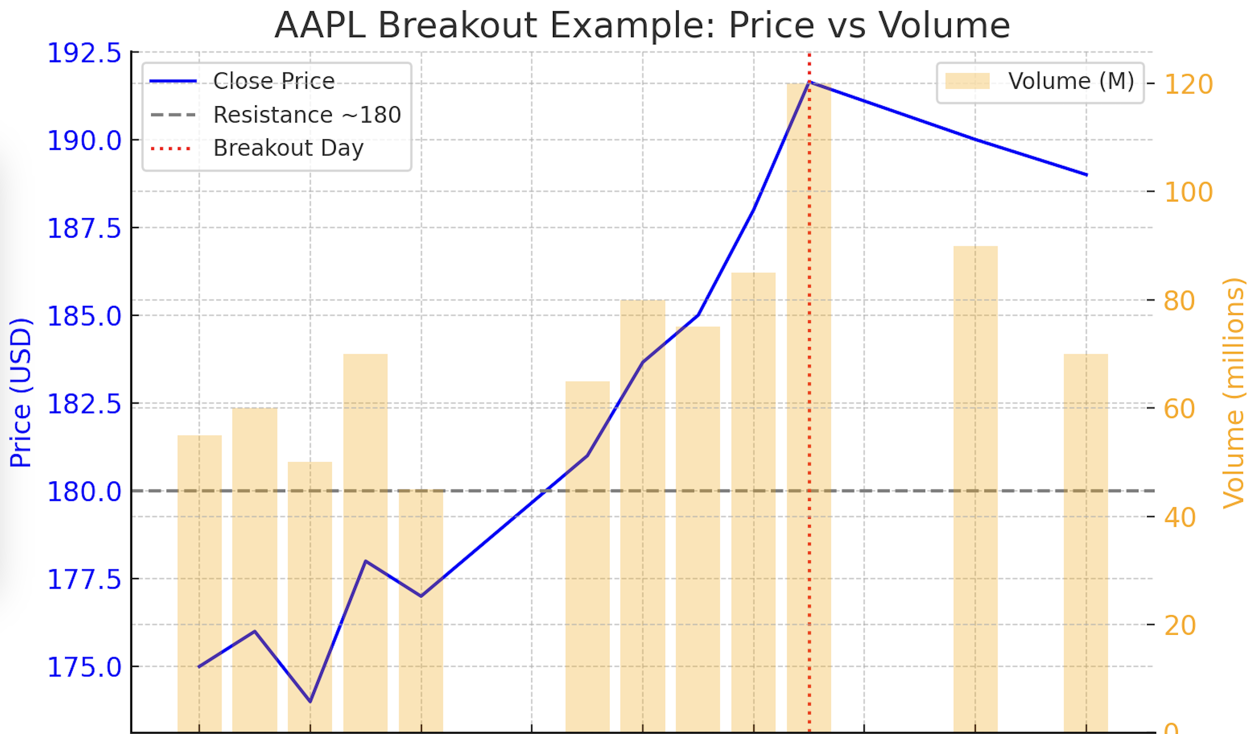 Let's walk through a real example with Apple Inc. (AAPL), tying everything together. In June 2023, Apple's stock had been trading below a price resistance around $180 (its previous high from early 2022). On June 27, 2023, it finally closed above that level (~$183.7) and a few days later surged even higher. By June 30, 2023, AAPL closed at $191.64 - a clear breakout to all-time highs. We'll analyze this breakout through our confirmation ladder: