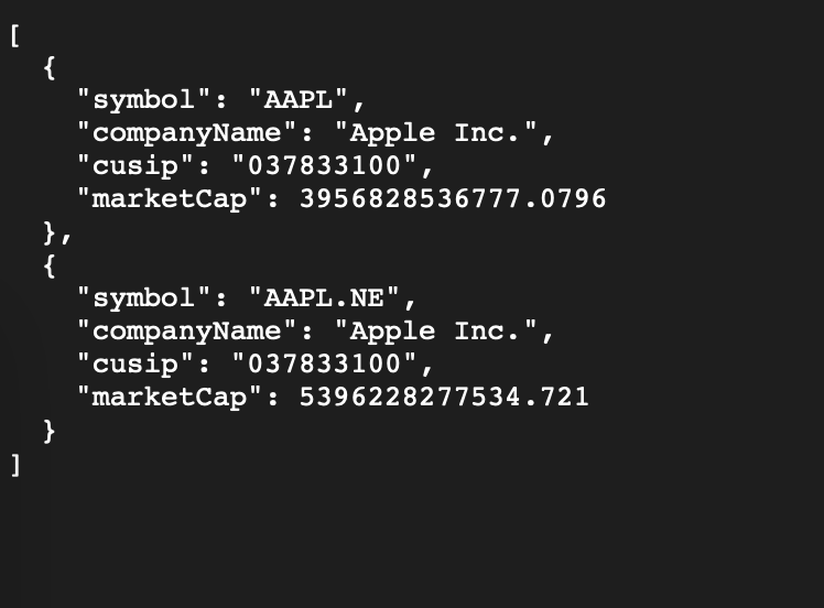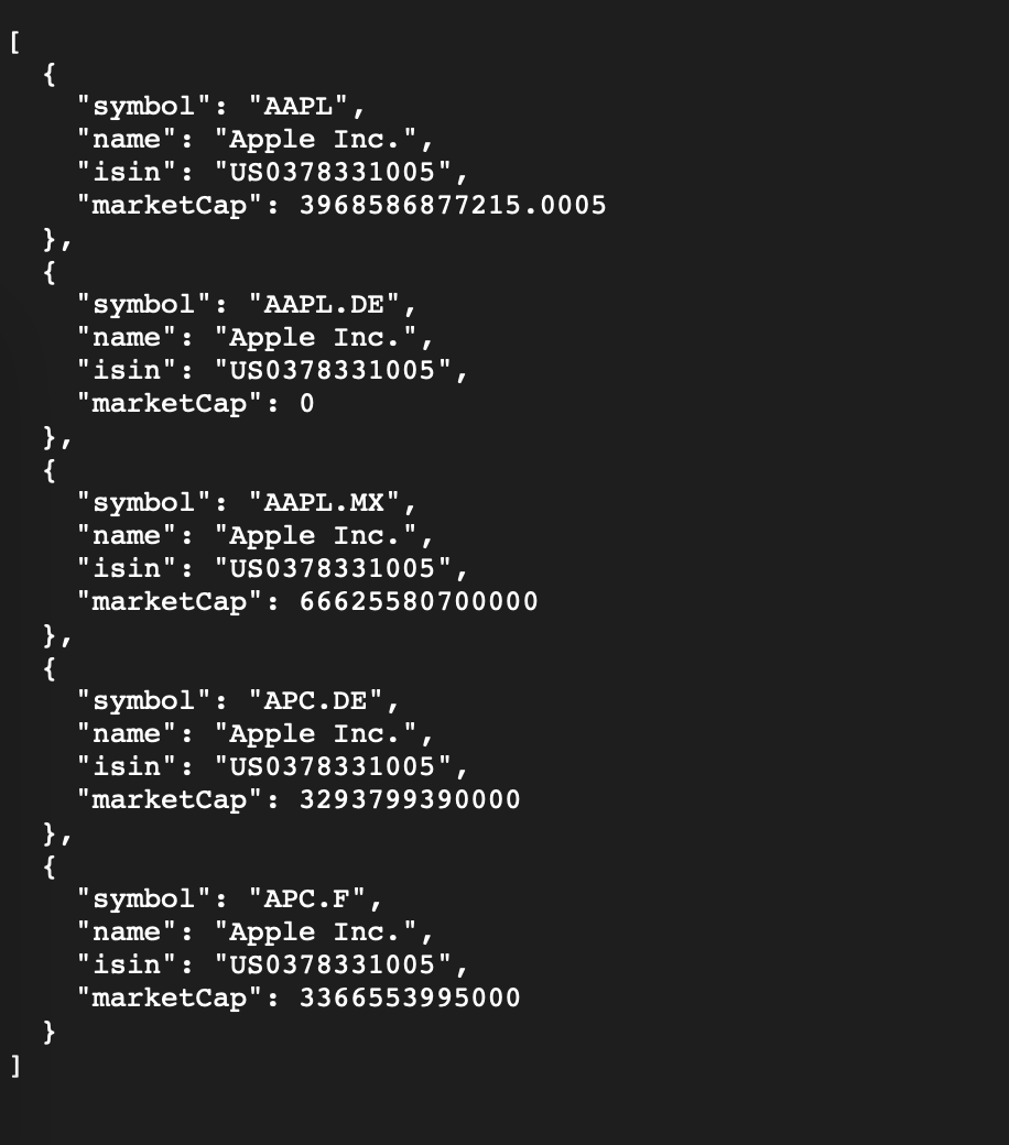 From this response, we see the ISIN corresponds to Apple Inc. (AAPL). We also get bonus information: Apple's market capitalization, which confirms we have the right company. We also see where else the stock is listed (5 different exchanges from the above example).