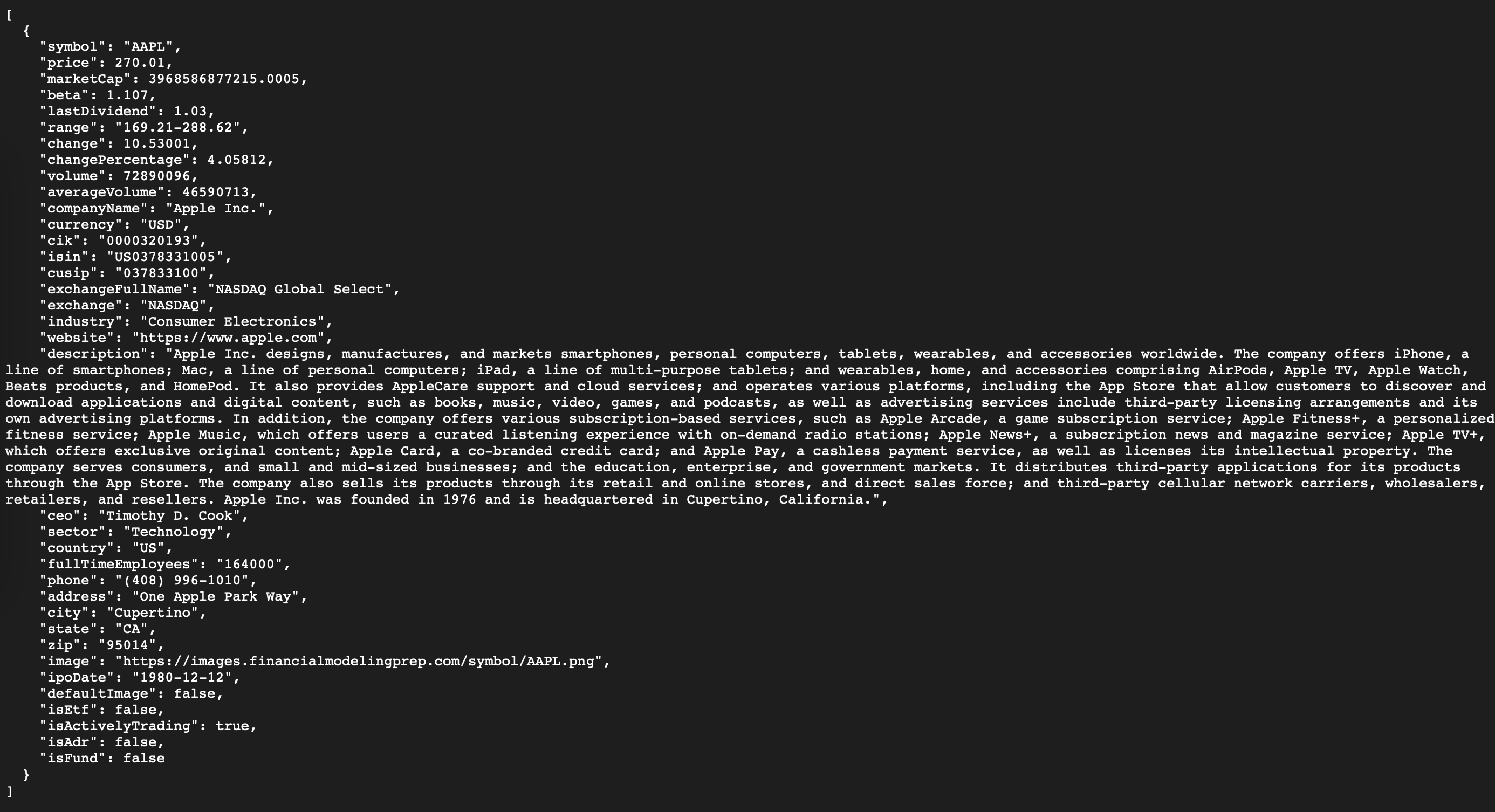 The key field for mapping is the "symbol": "AAPL" - now you can use that symbol to fetch stock prices, financials, or any other data in FMP.