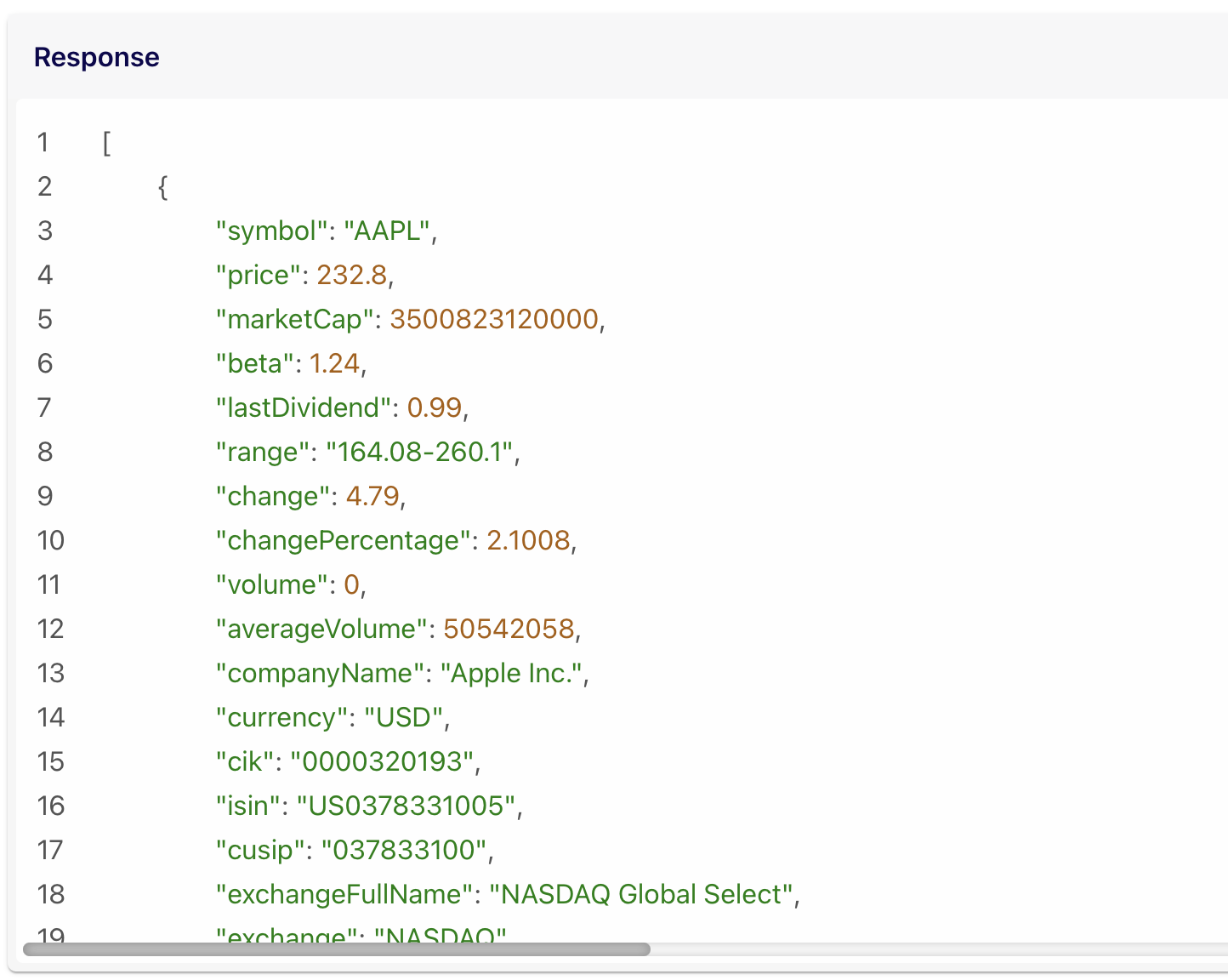 For instance, with a single query you can retrieve a company's market capitalization, industry classification, headquarters location, and even recent stock price in one go. An investor could pull Apple Inc.'s profile to see its industry, and key metrics at a glance, helping inform a first impression.