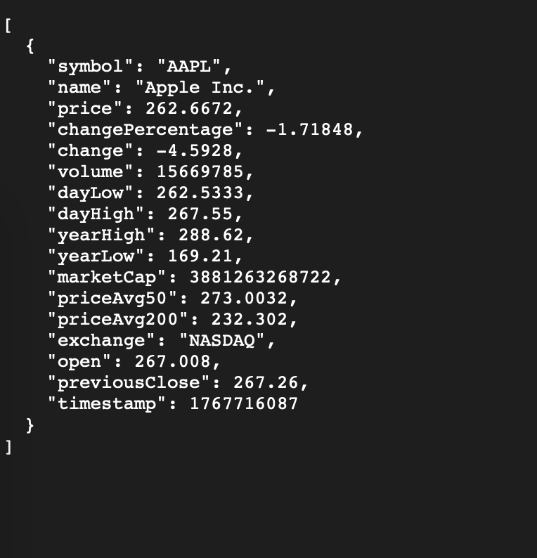 In practice, a developer could use FMP's batch quote endpoint to refresh prices for a watchlist of 50 stocks in a single API call, updating a UI widget every few seconds. The data is delivered in JSON and is easy to integrate, whether you're updating a web app or feeding an algorithm.