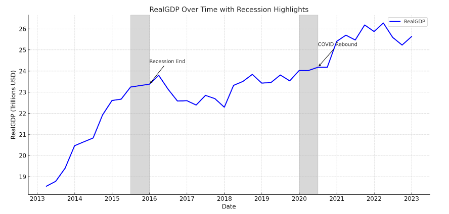 Figure: Example of a macro trend - Real GDP over time with recessions highlighted. Macroeconomic data like GDP can reveal the broader context for market conditions, as shown by growth dips during recession periods and post-crisis rebounds. Such charts add narrative depth to your analysis, connecting macro inflection points with market or corporate performance shifts.